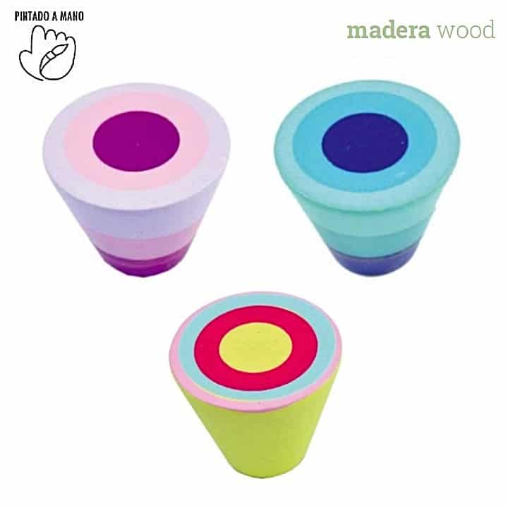 -Material: Madera Pintada a Mano. -Acabados: Morado / Azul / Amarillo. -Diámetro: Ø40mm. -Alto: 32mm. -Incluye 1 Unidad.